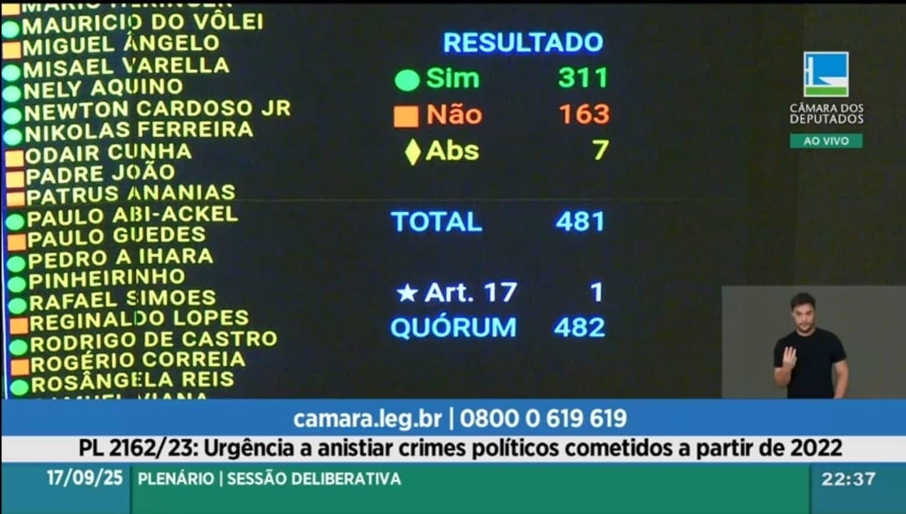 Hoje, 17 de setembro de 2025, Mais uma vez o Brasil demonstra a bondade e o amor ao seu povo. Desta vez foi a votação da urgência da anistia que visa soltar mais de 1500 brasileiros honestos que foram presos injustamente através de fraudes processuais e perseguições políticas pelo atual regime.